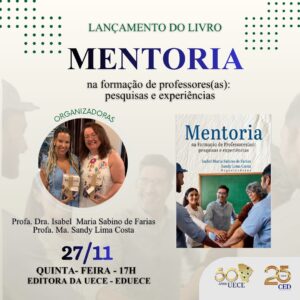 À esquerda, há um círculo com a foto de duas mulheres sorrindo, identificadas no card como “ORGANIZADORAS”. Elas estão abraçadas e segurando exemplares do livro. A primeira tem cabelo longo, e veste uma blusa azul. A segunda tem cabelo castanho, usa óculos e veste blusa branca com desenhos coloridos. Abaixo da imagem estão escritos seus respectivos nomes: Profa. Ma. Sandy Lima Costa e Profa. Dra. Isabel Maria Sabino de Farias. À direita da foto delas, há a capa do livro. A capa mostra cinco pessoas em uma sala de aula, formando um círculo e juntando as mãos no centro em gesto de união. Elas estão sorrindo.